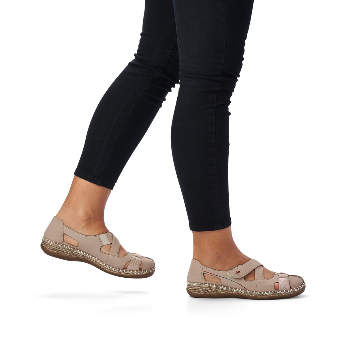 Ženske cipele Rieker 46451-60 karakteriziraju vrlo mekani i prilagodljivi materijali. Posebnost ovog modela je vrlo mekano gornjište izrađeno od prirodne kože dok je unutrašnjost obložena  mekanom kožnom tabanicom s efektom memo pjene. Potplat je izrađen od drugih materijala koji odlično prianja uz različite površine te apsorbira vibracije na najopterećenijim dijelovima stopala.