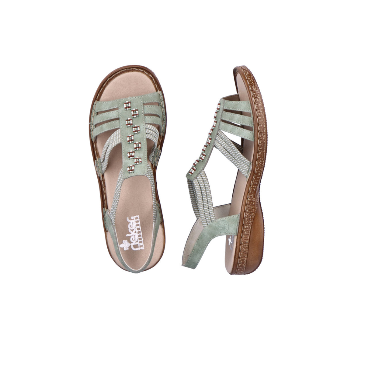 Ženske sandale Rieker 62855-52 idealne su i za dnevne i večernje varijante. Prekrasna zelena boja sa zanimljivim kuglicama (bež, smeđa, zelena) na gornjištu čini model dodatno posebnim i atraktivnim za nošenje. Jednostavno i praktično obuvanje i izuvanje maksimalno olakšavaju elastične gumice. Model je namijenjen svim generacijama.